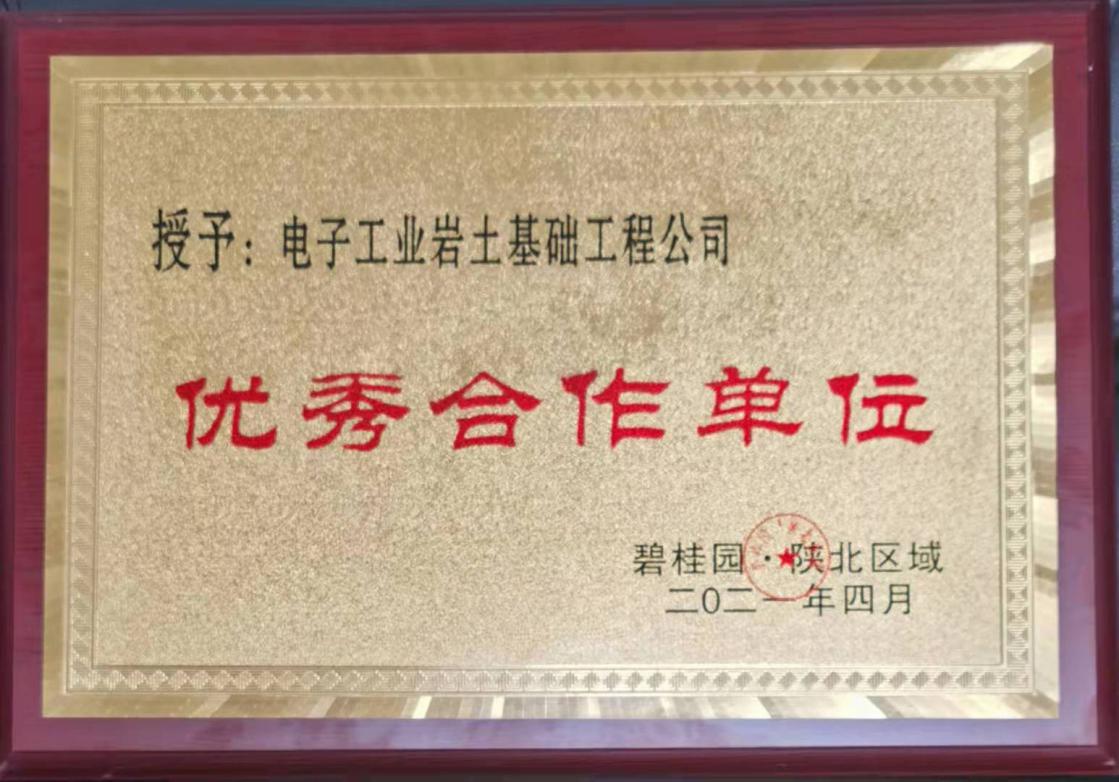 2021年4月15日,电子工业岩土基础工程公司公司加入碧桂园举行召开的陕北区域以“凝心聚力 合作共赢”为主题的合作方大会。电子工业岩土基础工程公司荣获2021年度碧桂园陕北区域优异合作单位称呼,以谢谢我公司优质、高效、快捷的服务。